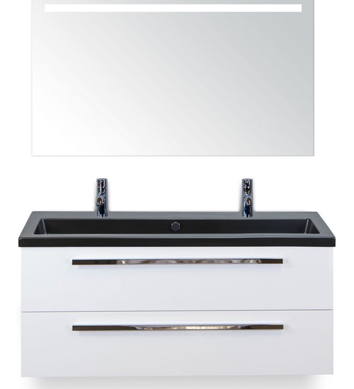 Badmeubelset 120 cm breed - bestaande uit: wastafelkast 2 laden, enkele keramische wastafel Djazz met twee kraangaten in zwart mat en spiegel met één horizontale verlichtingsbalk (LED)