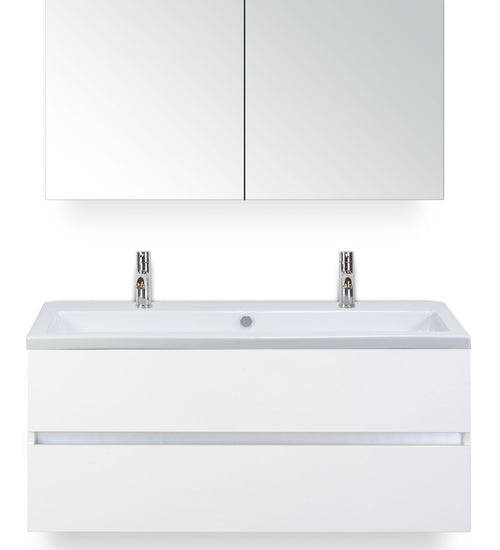 Badmeubelset 120 cm breed - bestaande uit: wastafelkast 2 laden greeploos, enkele keramische wastafel Djazz met twee kraangaten en spiegelkast