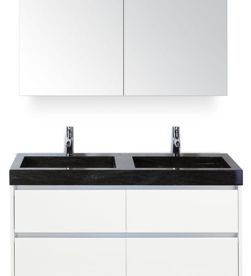 Badmeubelset 120 cm breed - bestaande uit: wastafelkast 4 laden, dubbele hardstenen wastafel Lucca met kraangaten en spiegelkast