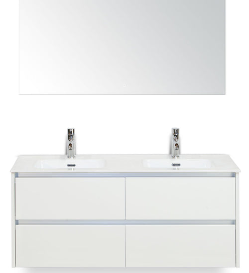 Badmeubelset 120 cm breed - bestaande uit: wastafelkast 4 laden, dubbele keramische wastafel Cover met kraangaten en luxe spiegel