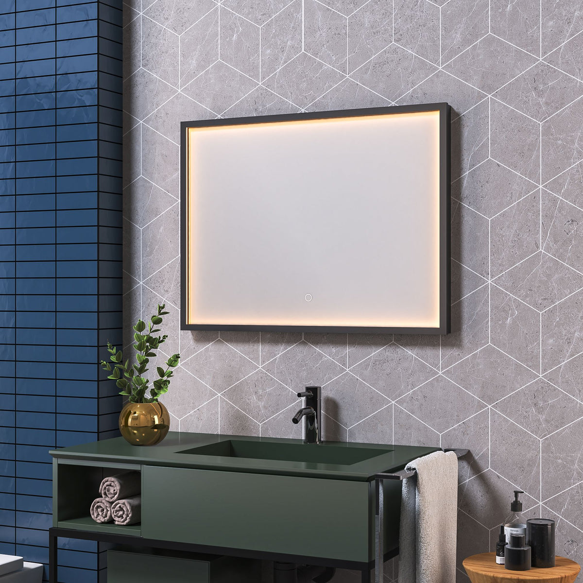 Spiegel Ghost Rectangle 140 x 70 cm met zwart frame, dotless indirecte verlichting vóór het glas, touchbediening (traploos dimbaar), kleurinstelling koud/warm en spiegelverwarming