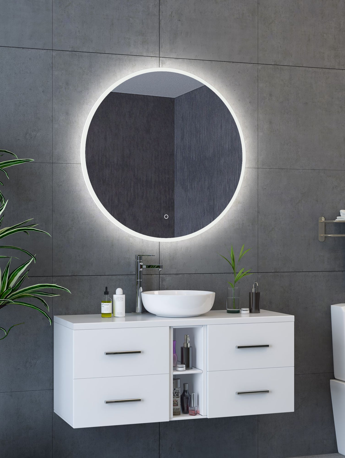 Spiegel Reflex Ø 100 cm met brede gezandstraalde rand, dotless indirecte verlichting rondom, touchbediening (traploos dimbaar) op voorzijde, kleurinstelling koud/warm en spiegelverwarming