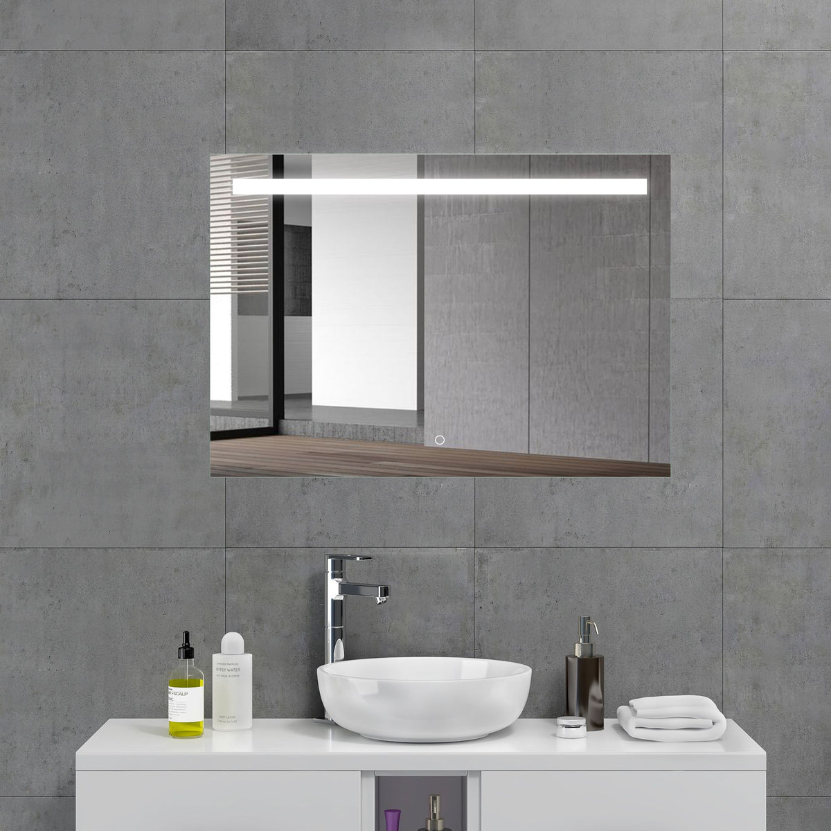 Spiegel Sence 140 x 70 cm met verlichtingsbalk boven, touchbediening (traploos dimbaar) op voorzijde, kleurinstelling koud/warm en spiegelverwarming