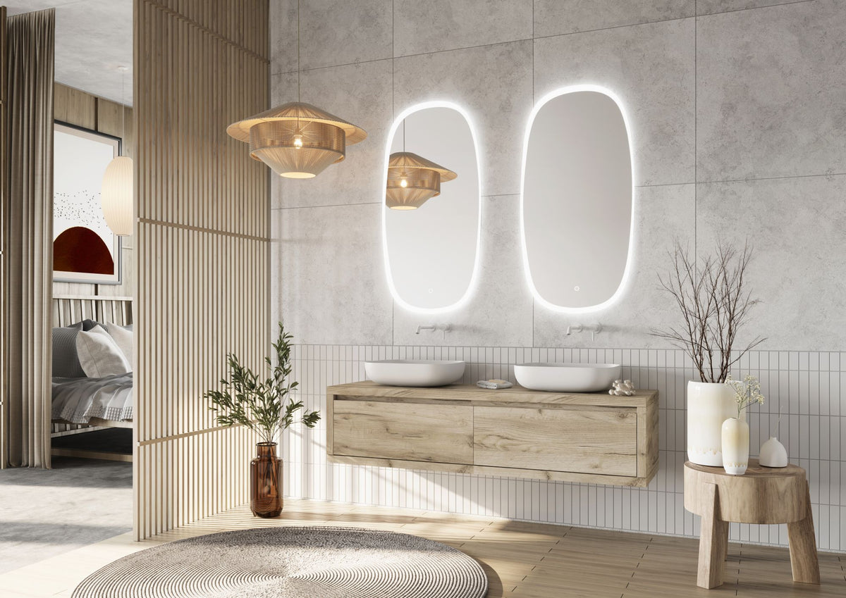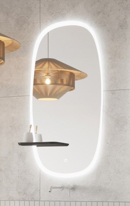 Spiegel Vibe ovale/organische vorm 60 x 110 cm met een afneembaar schapje in het zwart, met gezandstraalde rand, dotless indirecte verlichting rondom, touchbediening (traploos dimbaar) op voorzijde, kleurinstelling koud/warm en spiegelverwarming